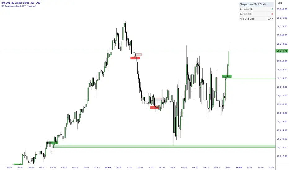ICT Suspension Block HTF [Herman] automatically detects and plots Suspension Blocks (SB) on your chart and optionally pulls them from higher timeframes. It’s built for traders who want precise, visual SB zones with mitigation/entry alerts and a compact stats panel.