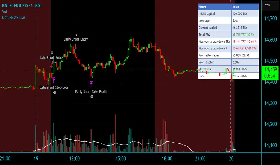 DorukBot is a hit and run indicator so it's main purpose is to enter positions in intra-day movements at price action levels.