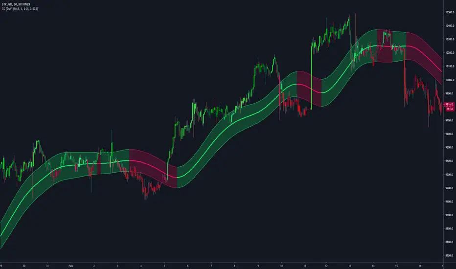 Filtered true range with a specified multiplier is then added to and subtracted from the filter, generating a channel.