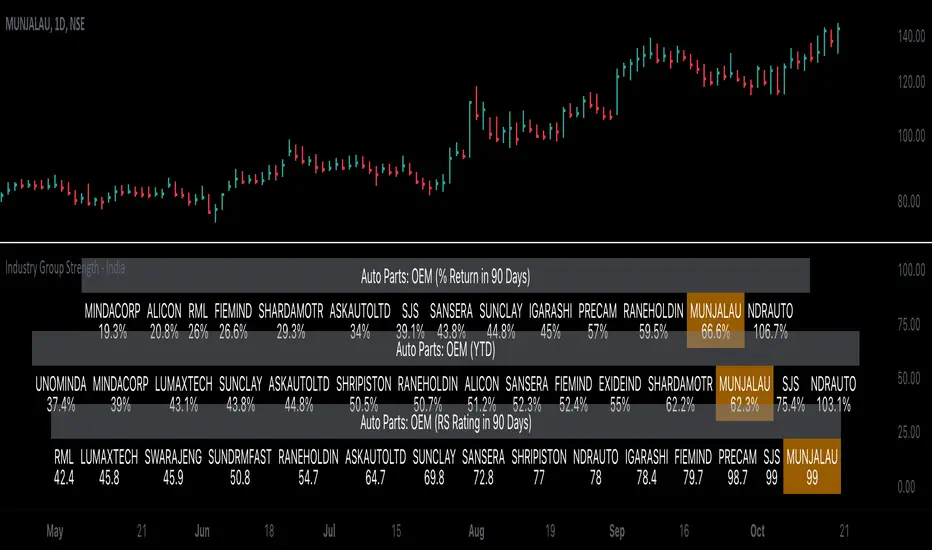 Presenting the Industry Group Strength Indicator for India market, designed to help traders identify top-performing stocks within specific industry groups that are predefined.