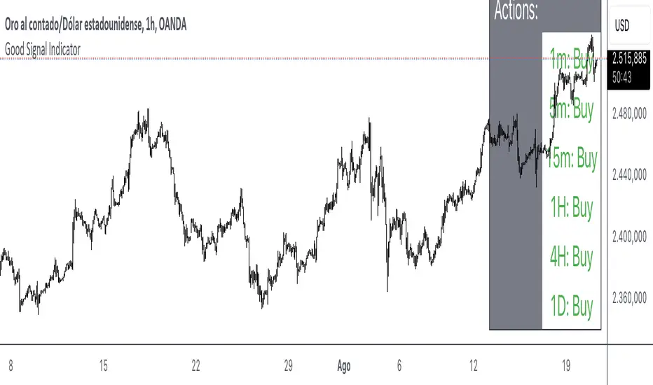 Description:The Good Signal Indicator utilizes Exponential Moving Averages (EMA) across multiple timeframes to provide buy or sell signals based on the relative positioning of short-term and long-term EMAs.