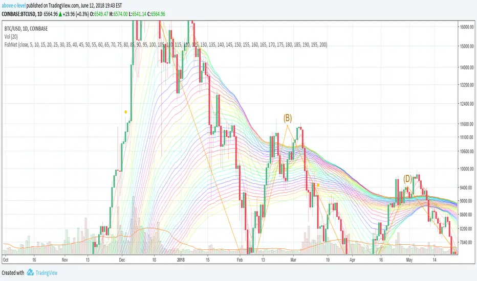 A more aesthetic fishnet with exponential moving averages. It's likely that this doesn't display support/resistance quite as well as an SMA fishnet, but it looks pretty.