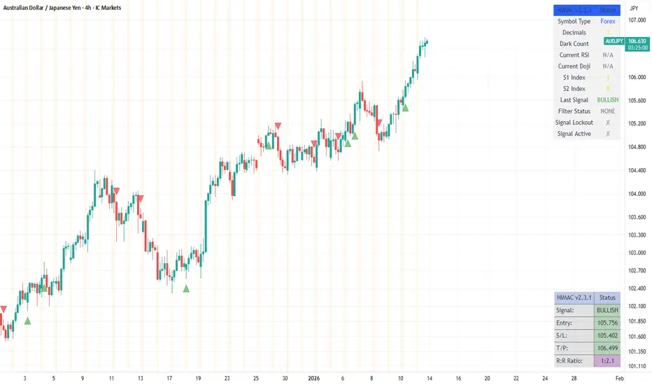 HiMAC (High-Probability MACD) is a multi-timeframe confluence trading indicator that identifies high-probability reversal signals using MACD histogram patterns combined with RSI and Doji filtering.