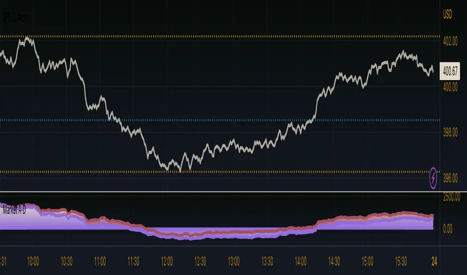 This indicator is meant to observe NYSE & NASDAQ Advance minus Decline Oscillator in one. It also paints extreme levels at +2000 and -2000. It is used in combination to identify changes across the two markets or to observe broad market strength/weakness.