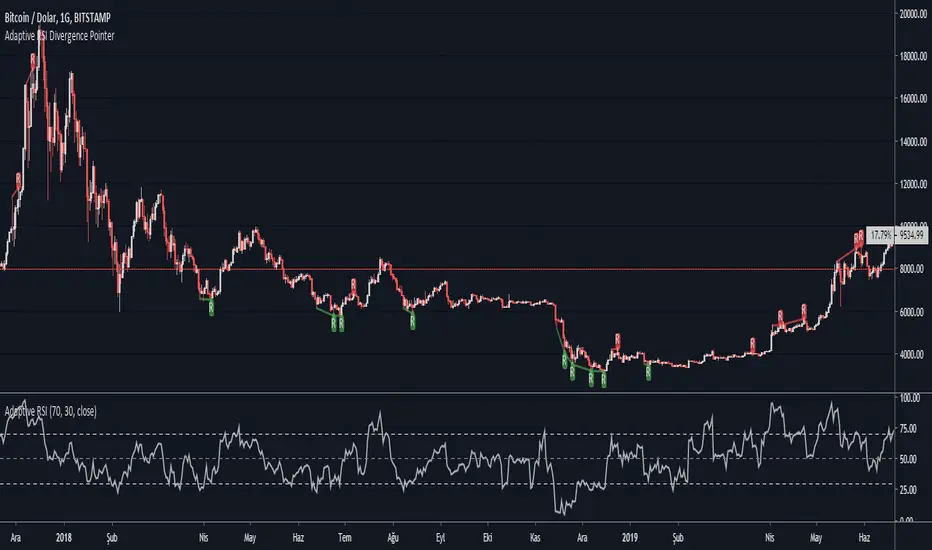 This script points regular and optionally hidden types of bullish and bearish Adaptive RSI divergences on the chart by drawing the divergence lines and optionally labels.