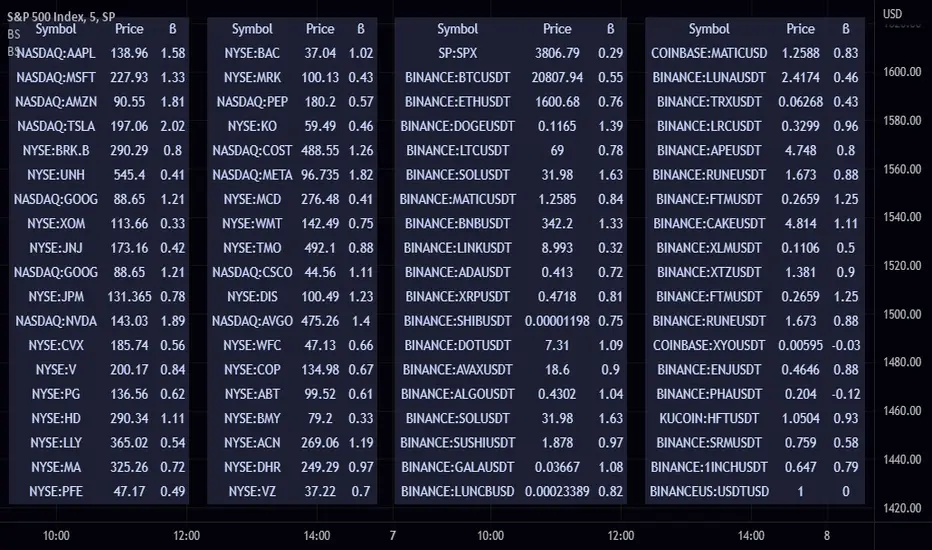 This script allows you to screen up to 38 symbols for their beta. It also allows you to compare the list to not only SPY but also CRYPTO10! Features include custom time frame and custom colors.