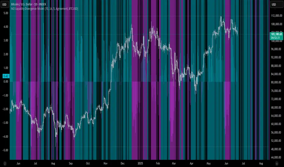 The M2 Liquidity Divergence Model is a macro-aware visualization tool designed to compare shifts in global liquidity (M2) against the performance of a benchmark asset (default: Bitcoin). This script captures liquidity flows across major global economies and highlights whether price action is aligned ("Agreement") or diverging ("Divergence") from macro trends.