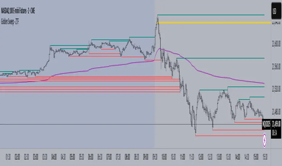 The Golden Sweep combines six distinct market structure analysis methods into a unified confluence system designed to identify high-probability reversal points at inverse Fair Value Gaps (iFVGs). Rather than relying on single-indicator signals, this system requires simultaneous confirmation across multiple independent market dimensions to filter out noise and reduce false signals.