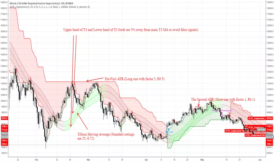 When both ATR (Long and Short) are in downtrend and the bar closes below Lower Tillson's moving average band: Enter Short