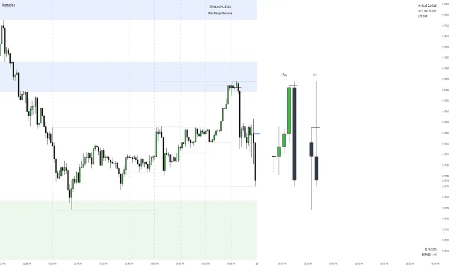 This TradingView indicator, created by Detrades, serves multiple functions to assist traders in making informed decisions. It displays the projection of HTF (Higher Time Frame) candles, allowing users to choose the timeframe that best suits their needs. The indicator also highlights sweep liquidity high/low candles on HTF candles, providing a clearer view of market behavior. Additionally, it includes a CISD (Change In Structure Detection) feature to confirm trend reversals on LTF (Lower Time Frame) candles, which is often used for entry signals. The indicator also offers a customizable watermark for personalization, ensuring a tailored trading experience.update