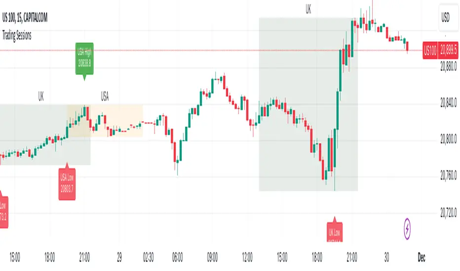 Trading Sessions with Highs and Lows is designed to visually highlight specific trading sessions on the chart, providing traders with key insights into market behavior during these time periods. Here’s a detailed explanation of how the indicator works: