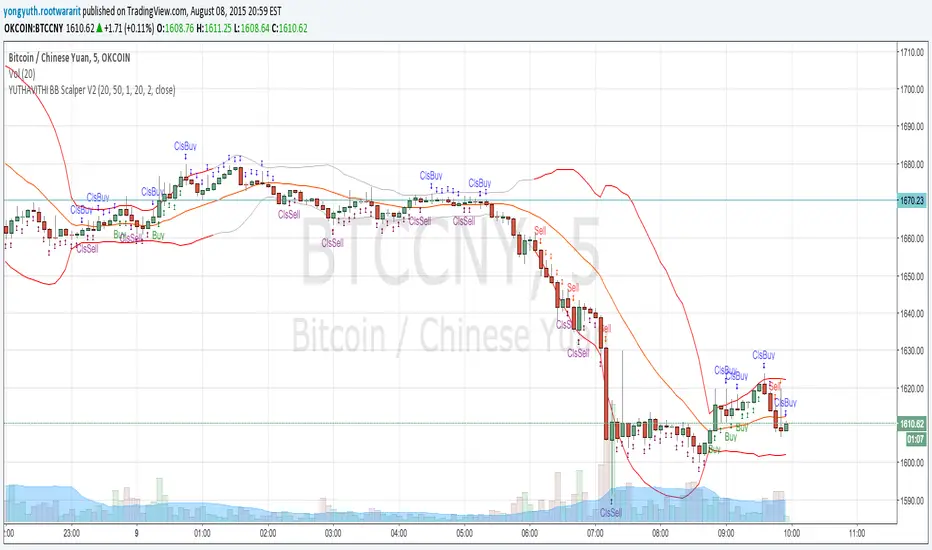 This is a trend based BB scalper. I notice when the trend is fading and the price is going to leave the upper/lower band, the opposite band will stop expanding and turn back. This can serve as a good point for profit taking.