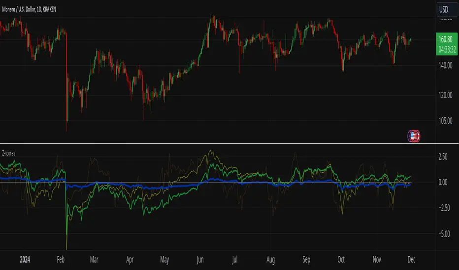I'm adding this to the public repository because there isnt a good z-score implementation here on TradingView, and especially not one that offers an adjustable ribbon like this. For the sharp eye, there is useful signal in z-scores, whether applied to a single asset, or to compare the performance of two assets against each other.