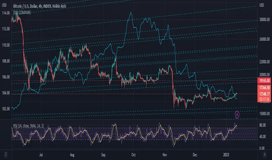 Overlays the DXY chart over the top of any other chart. When the dollar strength increases, asset prices can drop and vice versa. Was created personally to compare with the price of Bitcoin.