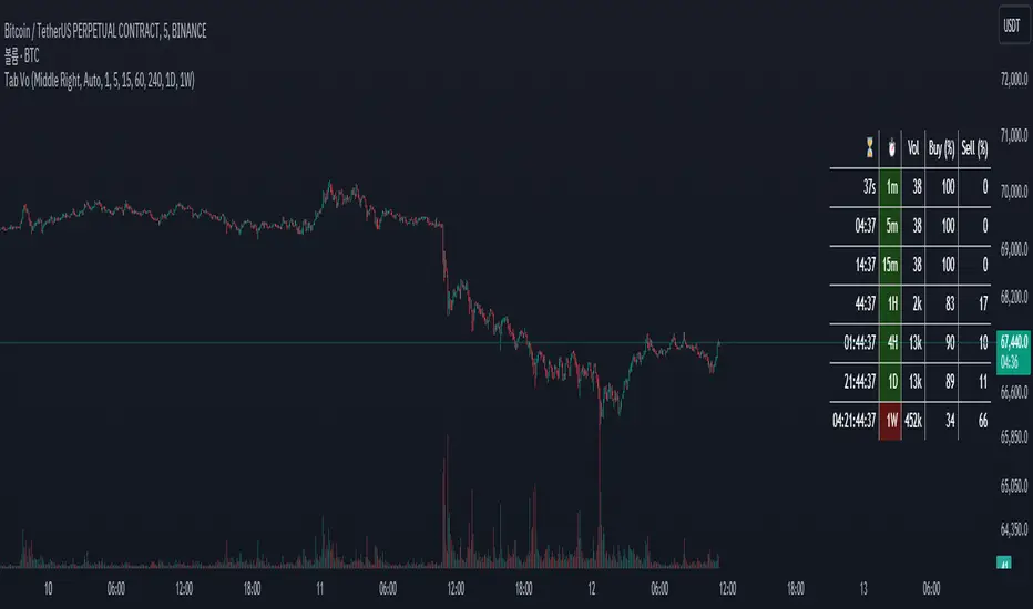 The Table Volume Multiframe indicator displays volume information across multiple timeframes in a convenient table format. Users can customize the table's position, size, and the specific timeframes to be displayed. This indicator helps traders analyze volume trends and divergences across different timeframes, providing a comprehensive view of market activity. The table shows the total volume, buy percentage, sell percentage, and a countdown timer for the next bar close for each selected timeframe. The countdown function updates consistently to provide real-time information.