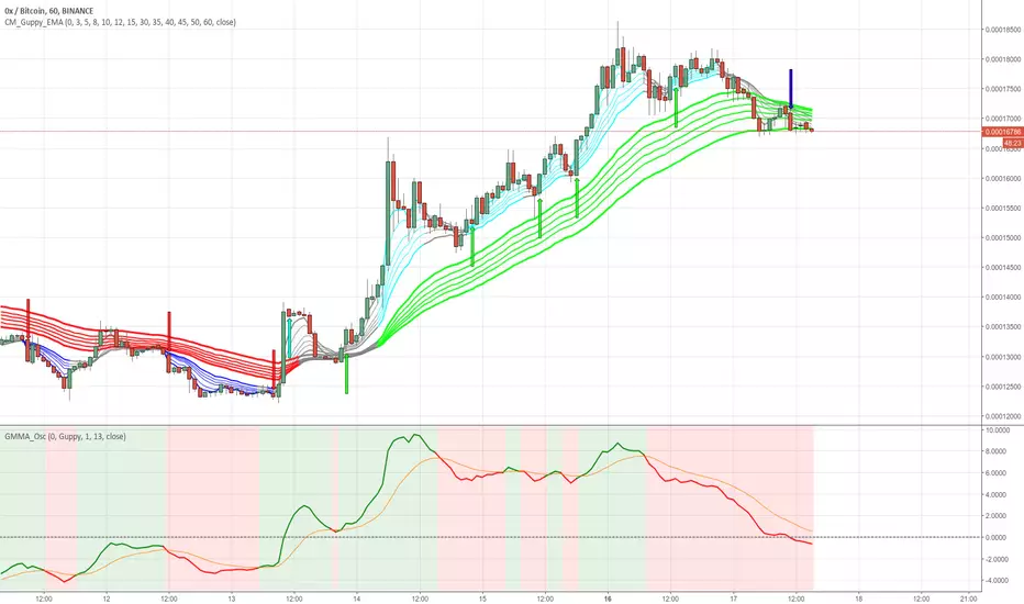 The GMMA Oscillator is a technical indicator developed by Leon Wilson. The oscillator line, which percentage difference between the Fast and Slow GMMA sets. The second line is the signal line and it is simply the exponential moving average of the oscillator line.
