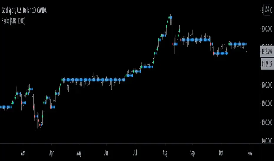 These Renko values are plotted as "Renko Dots" on your chart. The dots can be either green, red, or blue depending on market movements.