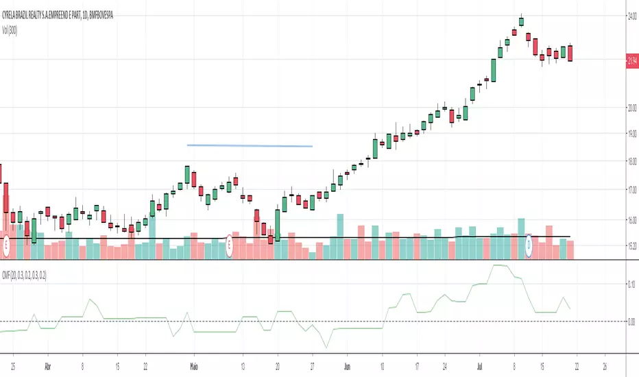 O fluxo do dinheiro em velas eh baseado no Chaikin Money Flow e utiliza o conceito que o que importa eh a relacao do corpo com o tamanho total do candle. Assim, utilizamos a formula: