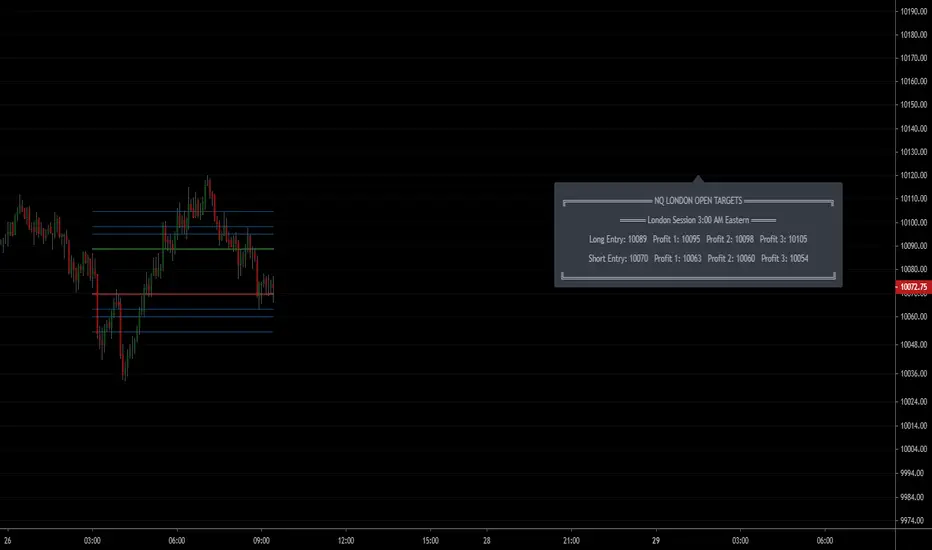 The lines and the text box are updated after the first 1 MINUTE bar closes for London session. The London session open is defined as 3:00AM - 3:01AM, Eastern time.
