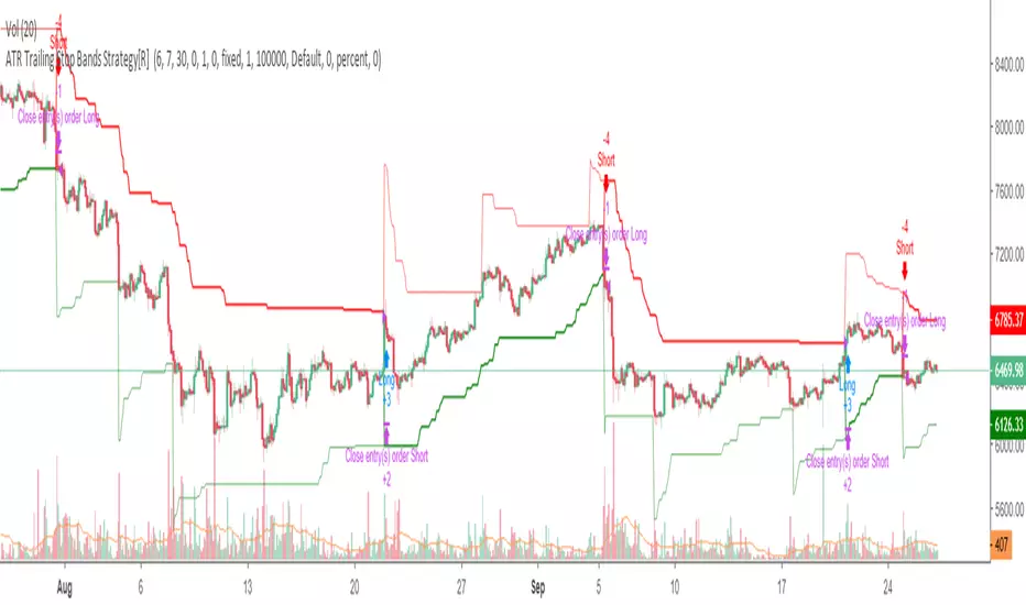 Originally based on a script by HPotter for an ATR Trailing Stop, which itself was based on an article by Sylvain Vervoort, but I adapted it to add Bands, to add extra optional Wick Protection, and have now made it a Strategy. It's not great for entries/exits, but as a Trailing Stop that can let winners ride, it's great.
