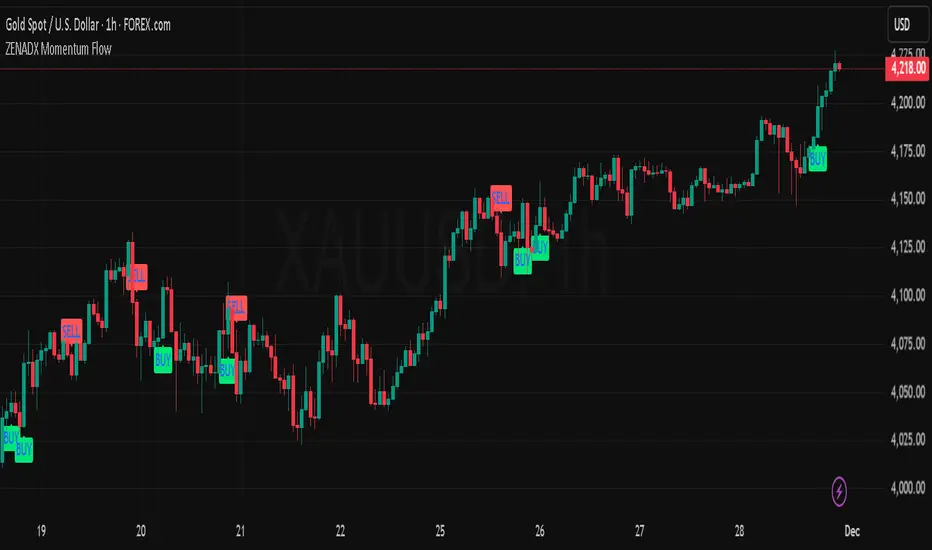 ZENADX Momentum Flow is a trend–momentum hybrid indicator designed for traders who want clarity, simplicity, and precision. Inspired by Zen principles, this tool helps you align with the market’s natural flow—without noise or over-complication.