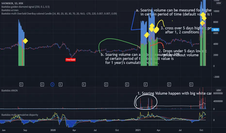 b. Soaring volume can also be measured by 10% of certain period of time(default value is for 1 year)'s cumulative volume . (green area) => you can adjust this ratio input. the higher value is the more likely to trail of whale
