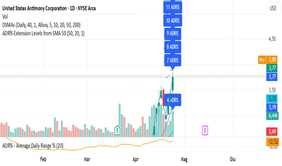 I created this indicator inspired by RealSimpleAriel (a swing trader I recommend following on X) who does not buy stocks extended beyond 4 ADR% from the 50 SMA and uses extensions from the 50 SMA at 7-8-9-10-11-12-13 ADR% to take profits with a 20% position trimming.
