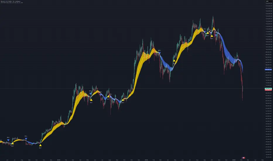 Trend following EMA ribbons. Center line changes color based on ATR in relation to trend. Undecided trend plotted in light grey. Inspired by a modified MACD and Larsson Line ribbon.