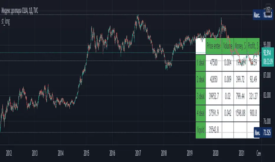 This indicator allows you to schedule a long trade for several trades (from 3 to 5). Variable parameters of the indicator: leverage, Martingale coefficient, risk per trade, number of trades, entry price, estimated take profit price and table position (by default, from the bottom right, possibly from the top right). The table shows the grid of orders: order prices, position volumes, the amount of funds per order and the potential profit if this order is executed and eventually the price closes with a take profit.