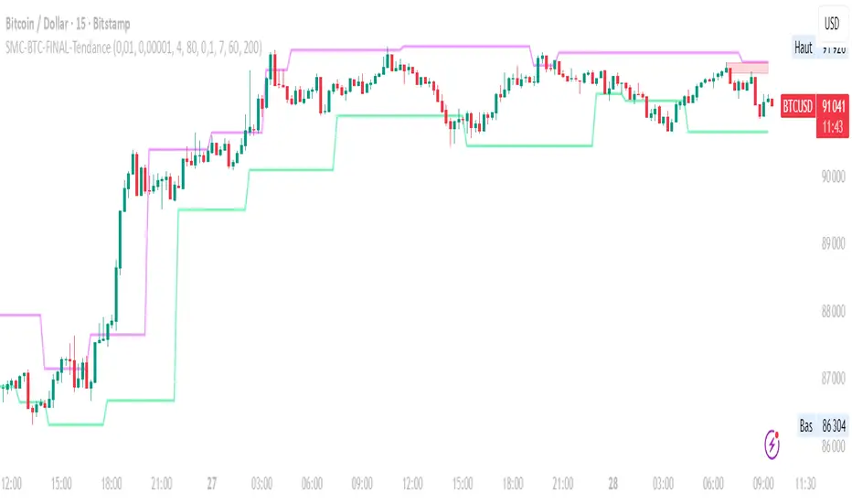 Input Parameters (Optimized for BTC/EUR M15)Users can adjust these parameters to modify sensitivity and risk profile. The default values are those optimized for the high-performing backtest (Profit Factor $> 3$).ParameterDescriptionDefault Value (M15)Long. Swing (BOS)Candle length used to define the swing (and thus the BOS).4Long. Recherche Liq.Number of candles to scan to confirm a liquidity sweep.7Tolérance Liq. (%)Price tolerance to validate the liquidity sweep (as a percentage of price).0.1Timeframe TendanceChart timeframe used for the EMA filter (e.g., 60 = H1).60 (H1)Longueur EMA TendancePeriods used for the trend EMA.200Lot Max (Quantité Max BTC)Maximum quantity of BTC the strategy is allowed to trade.0.01Lot Min Réel (Exigence Broker)Minimum quantity required by the broker/exchange.0.00001