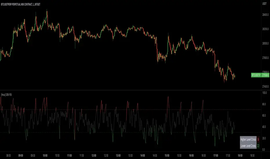 A distinctive feature of this OBV RSI indicator is the addition of a monitor that counts the number of times the RSI crosses above the higher level and below the lower level within a user-defined lookback period. This monitor is displayed as a table in the bottom right corner of the chart and can be enabled or disabled through an input option.