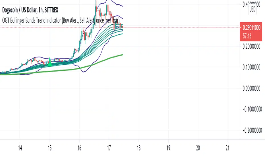 - Indicator waits for price to close above midpoint BB with shorter term EMAs all still aligned (not crossed)