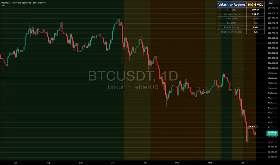 Most traders use the same position size regardless of market conditions. This leads to excessive risk during high volatility periods and missed profits during calm periods. Standard volatility indicators (ATR, Bollinger Bands) show current values but don't automatically classify market regimes.