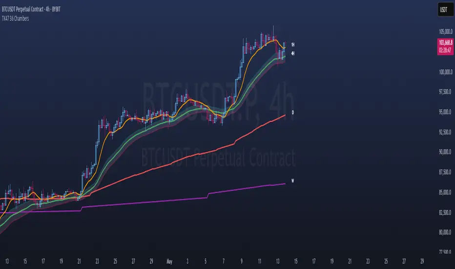 TK47 36 Chambers is a precision-crafted EMA (Exponential Moving Average) tool designed to help traders align with multi-timeframe trends while keeping price action clear and uncluttered. Built around the powerful 36 EMA, this script plots the current timeframe’s high, low, and median EMAs as a visual "chamber" or cloud, giving instant feedback on intrabar dynamics.