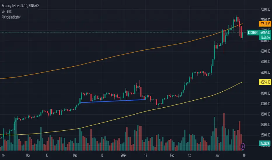 The Pi Cycle Indicator is a technical analysis tool used in finance, particularly within cryptocurrency markets, to identify potential market tops or bottoms. It is based on two moving averages: the 111-day moving average and the 350-day moving average of Bitcoin's price. The indicator suggests that when these two moving averages converge or cross each other, it may signal significant market turning points. The name "Pi Cycle" comes from the mathematical relationship between these two moving averages, roughly equivalent to the mathematical constant Pi (3.14). Traders and analysts use this indicator to gauge potential trend reversals and make informed decisions regarding their trading strategies. However, like any technical analysis tool, it should be used in conjunction with other indicators and fundamental analysis for a comprehensive understanding of market conditions.