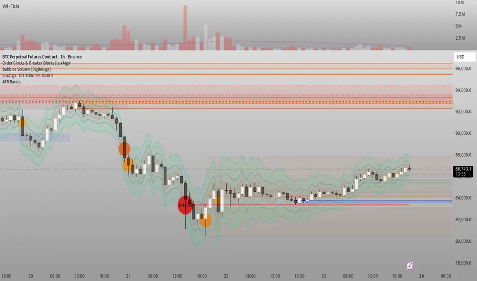 – Price breaks and closes outside green band + volume spike → enter aggressively in that direction (85%+ win-rate inside Killzones)