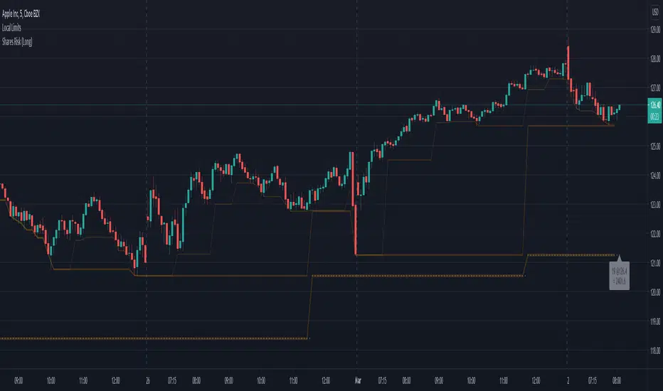 Based upon how much I'm willing to risk, and the price difference between the close and Risk Source, this indicator will show the number of shares to purchase such that if the price drops to the stop level specified, my value loss should be limited to the Risk Amount.
