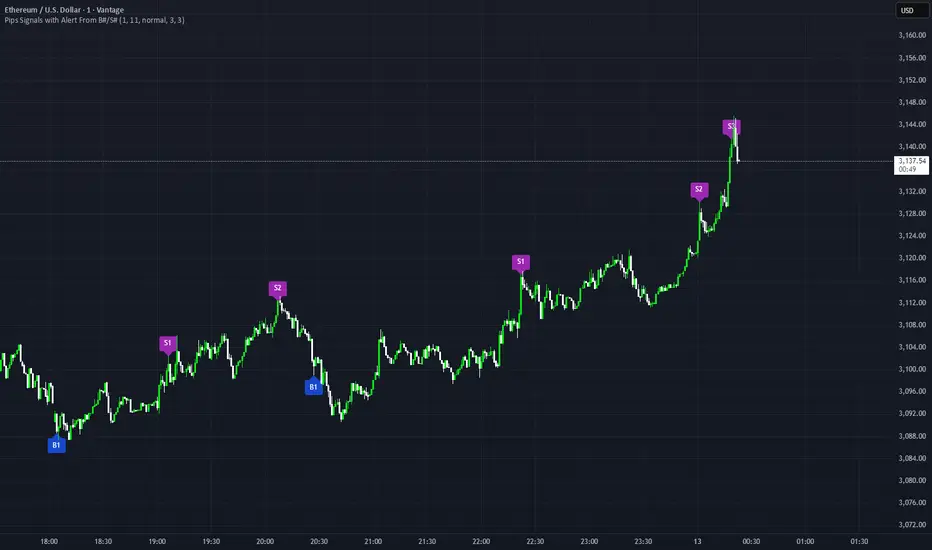 Pips Signals B#/S# is a price‑action‑driven indicator that generates sequential buy and sell signals based purely on pip movement, without relying on traditional oscillators or lagging indicators. It is designed for traders who prefer clean, rule‑based signals derived directly from market structure and price expansion.