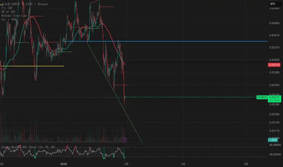 This script is a crypto-specific RSI indicator that automatically derives the base asset from the current trading pair (for example, ETHUSDT or ETHUSDT.P) and then calculates RSI using the corresponding BTC pair on Binance (for example, BINANCE:ETHBTC).