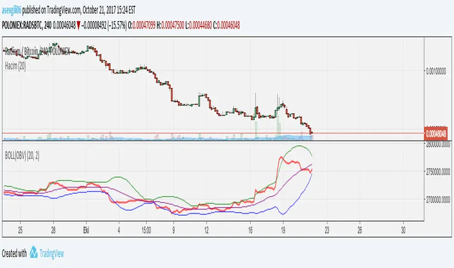 On balance Volume indikatörünün üstünde Bollinger Bant çalıştırıldı. Standart Sapma alt & üst çizgileri dışına taşmalarda, hacim konusunda sinyal üretmesi amaçlandı.