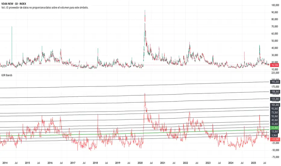 GSR Bands is an indicator designed to analyze the dynamics of an implied volatility index based on opening gaps. The model builds an accumulated series of gaps and generates additional offset bands derived from Fibonacci numbers and prime numbers (+10, +20, +30, +50, +70, +80, +110, +125).