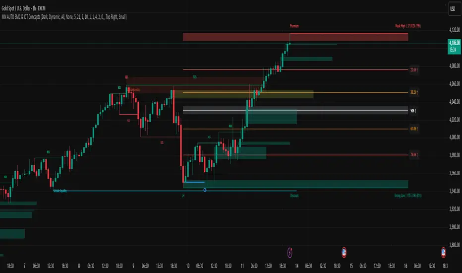 The MN AUTO SMC & ICT Concepts indicator is an advanced Smart Money Concepts (SMC) toolkit that combines ICT principles, Fair Value Gaps (FVG), Order Blocks (OB), Breaker Blocks (BB), Liquidity Zones, and Market Structure (BOS/CHoCH) into one unified system.