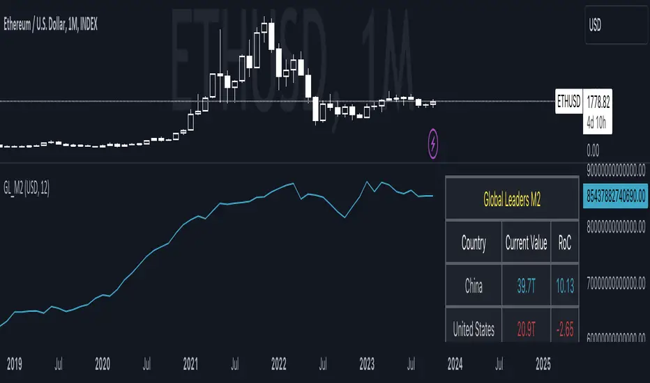 The Global Leaders M2 indicator is a comprehensive tool designed to provide you with crucial insights into the money supply (M2) of the world's top 10 economic powerhouses. This powerful indicator offers a wealth of information to help you make informed decisions in the financial markets.