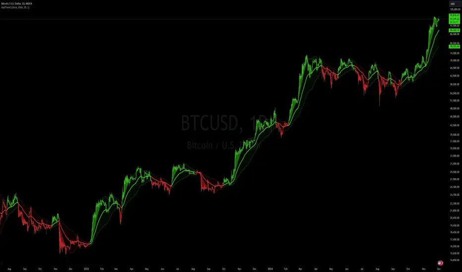 The AadTrend indicator is an experimental trading tool that combines a user-selected moving average with the Average Absolute Deviation (AAD) from this moving average. This combination works similarly to the Supertrend indicator but offers additional flexibility and insights. In addition to generating Long and Short signals, the AadTrend indicator identifies RISK-ON and RISK-OFF states for each trade direction, highlighting areas where taking on more risk may be considered.