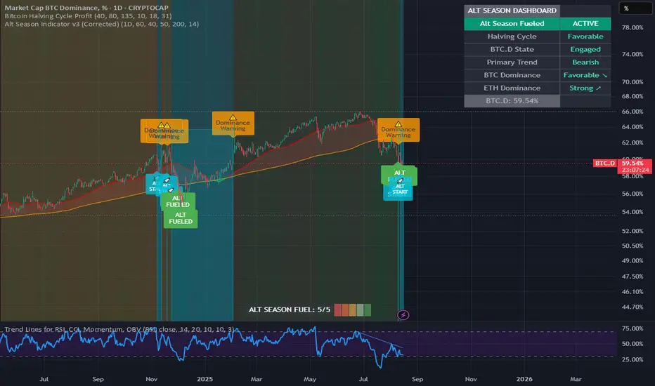⚠️ (Warning Sign): Appears if BTC.D reclaims the 60% start level, indicating a temporary pause or "reset" of the alt season.