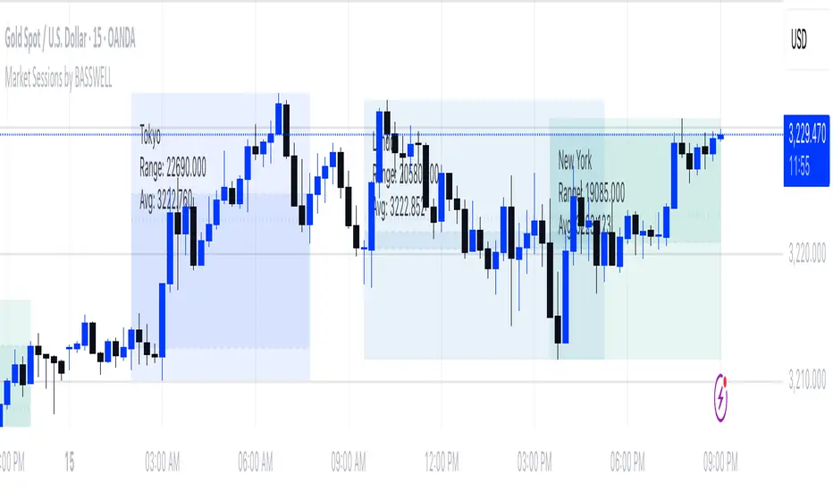 This TradingView indicator visually highlights major global trading sessions (Tokyo, London, New York) directly on intraday charts. It provides a clear, color-coded display of session activity and key statistics to help traders better understand session dynamics and overlaps.