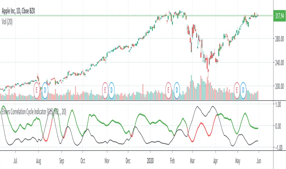 The Correlation Cycle Indicator was created by John Ehlers (Stocks & Commodities V. 38:06 (8–15)) and this is technically part of three indicators in one so I'm splitting each one to a separate script. This particular indicator was designed for trend direction and trend strength and simply buy when it is green and sell when it turns red. Also keep in mind that the higher the indicator is above the signal then the stronger the trend and when they are close together, conditions get choppy.