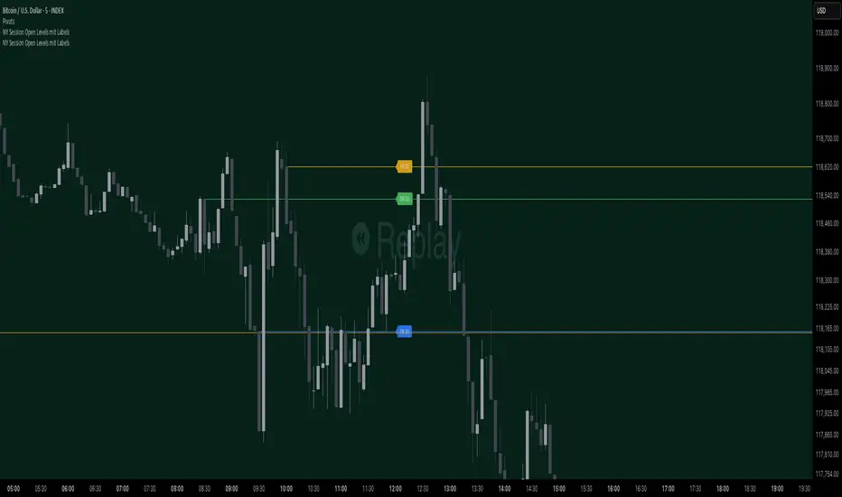 This indicator automatically draws horizontal lines at the opening prices of the New York trading session at 08:30, 09:30, and 10:00 AM NY time. Each line is labeled and extended to the right, providing clear reference points for key intraday levels. The lines and labels reset daily and are ideal for identifying reaction zones during the early U.S. trading hours.