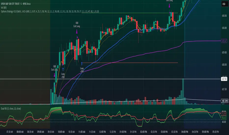 Options Strategy V2.0 is a robust, highly tunable intraday strategy that blends momentum, trend-following, and volume confirmation. It is ideal for disciplined traders focused on SPY or other 0DTE/1DTE options, and it includes guardrails to reduce false signals and improve execution timing.