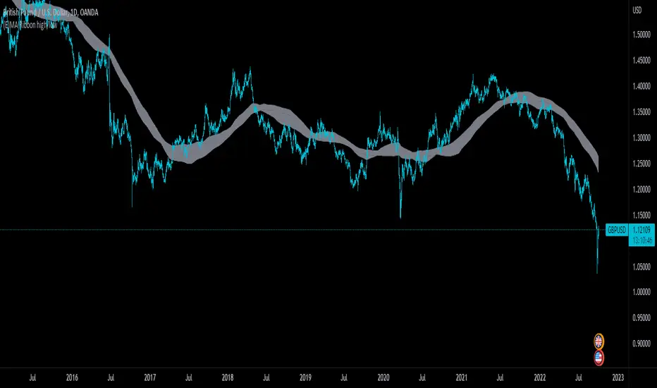 This is a slight modification of the standard Moving Average Ribbon. This script will take the 200 EMA and SMA with source the high and low, not the close.